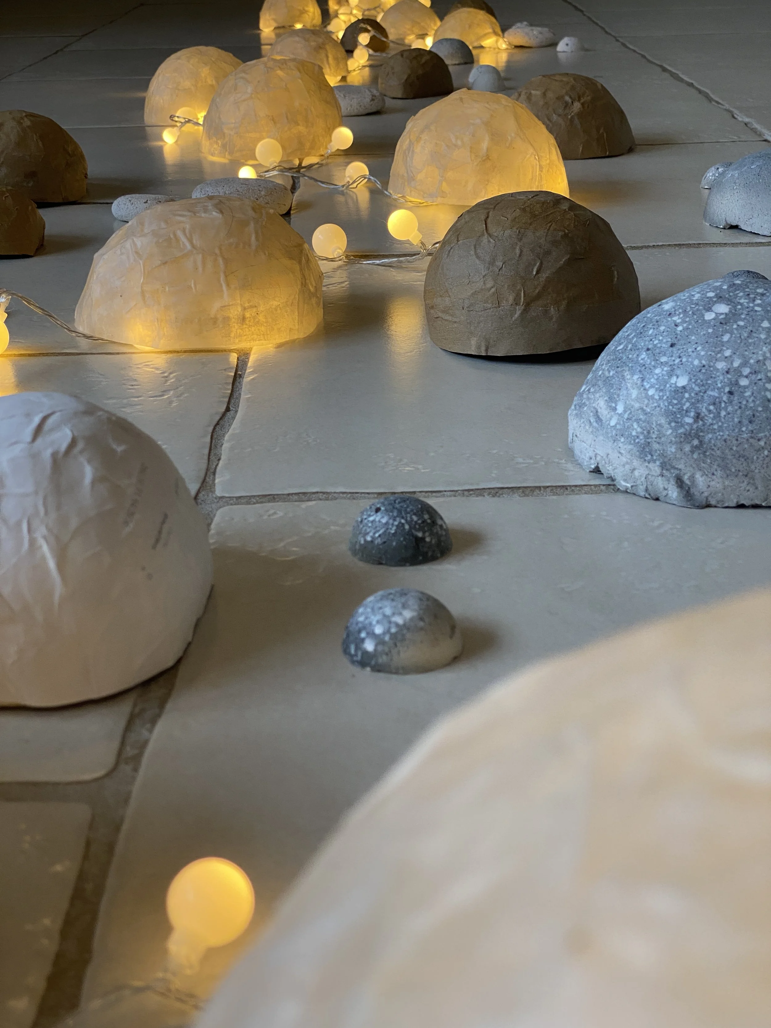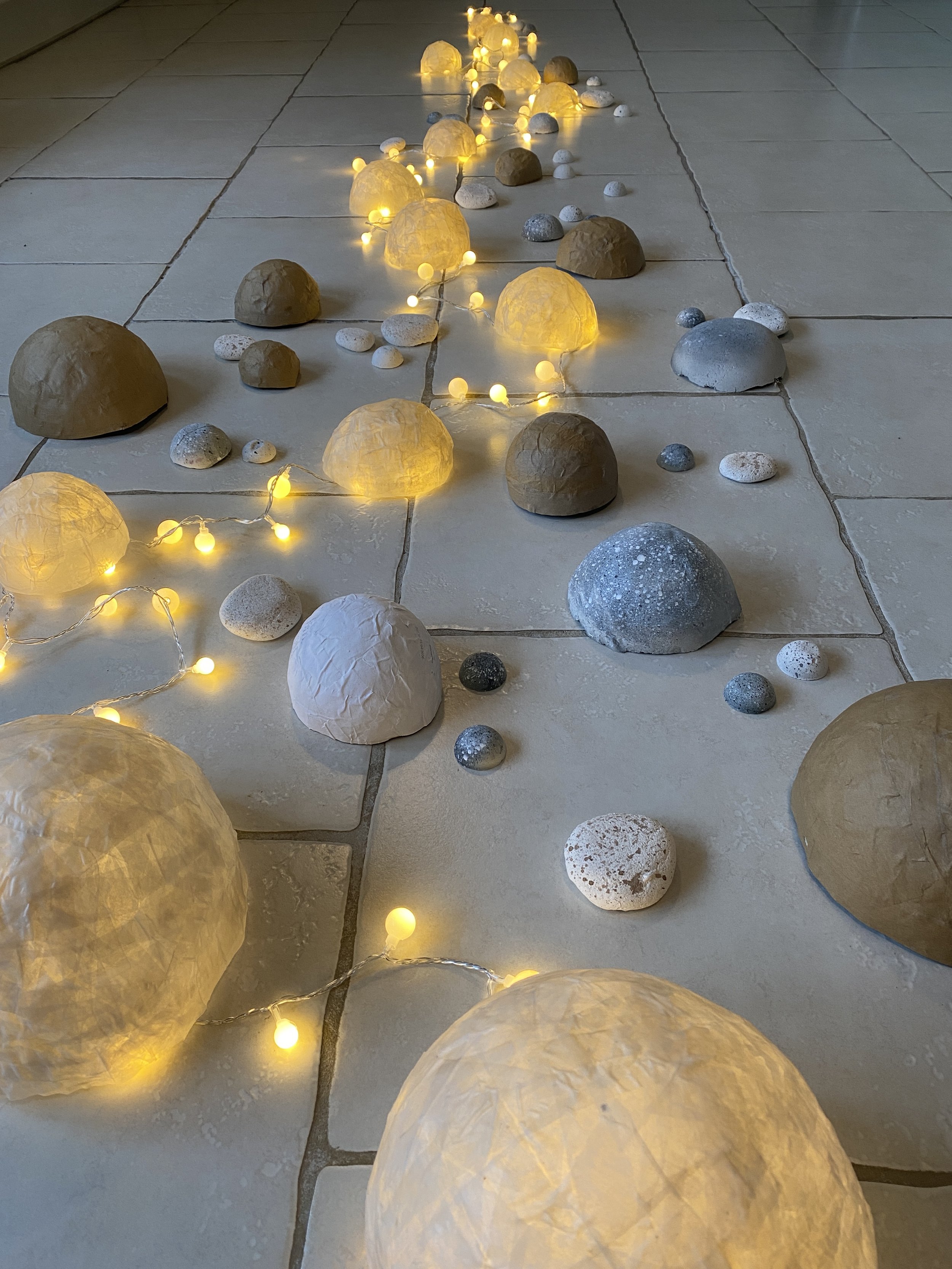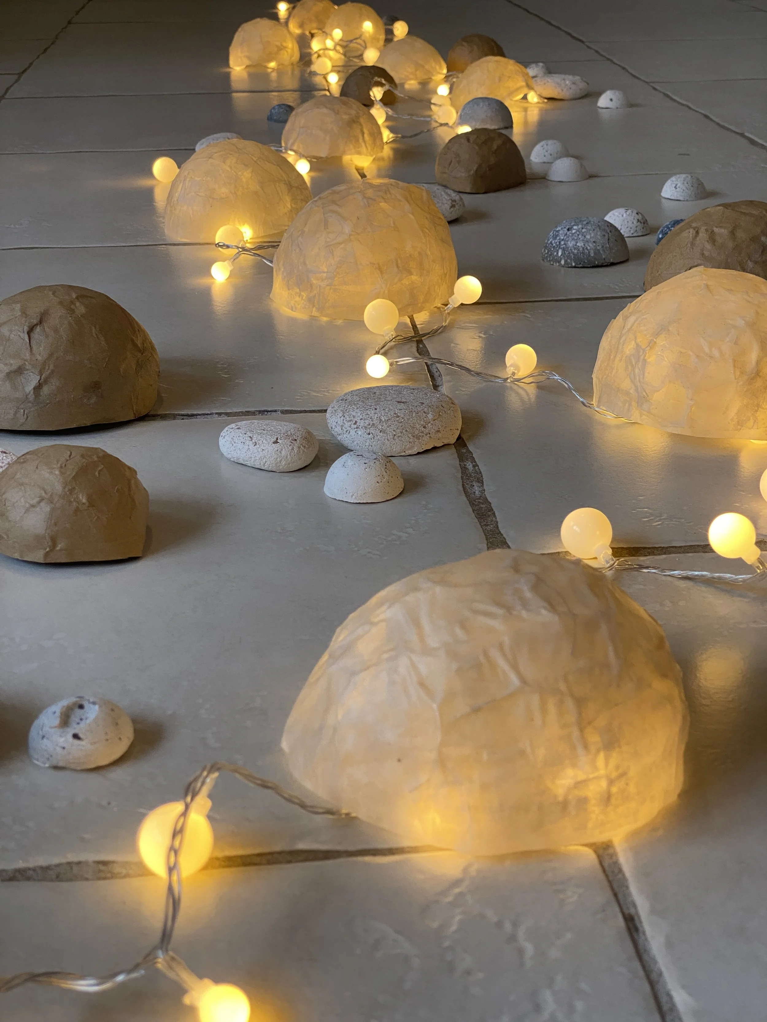 Installation au sol réalisée en papier mâché, plâtre et papier calque, certains éléments laissant filtrer la lumière d’une guirlande de LED.